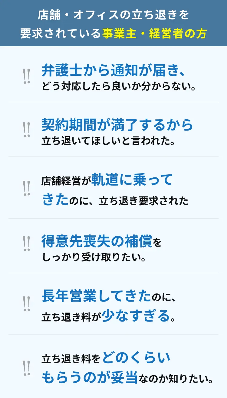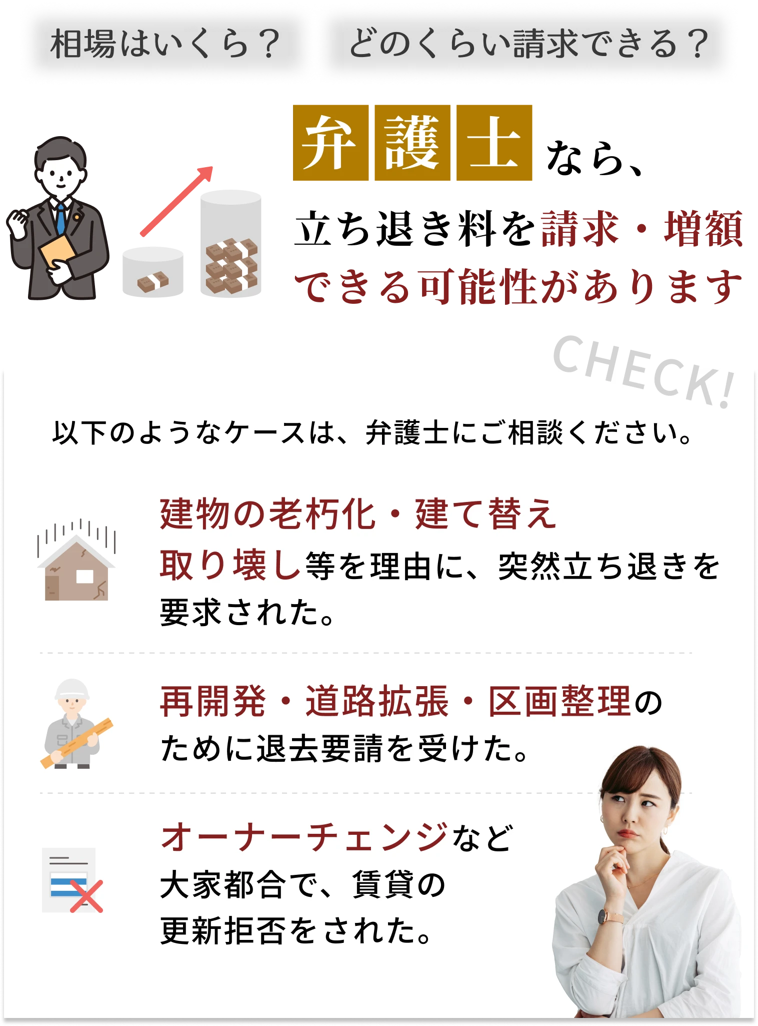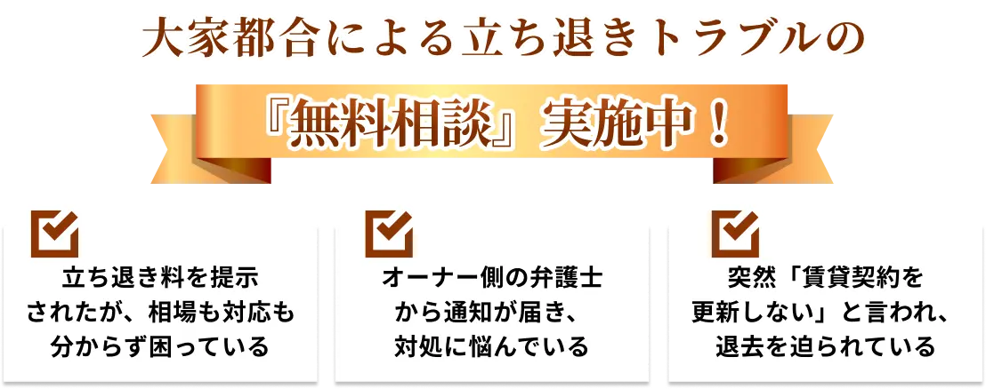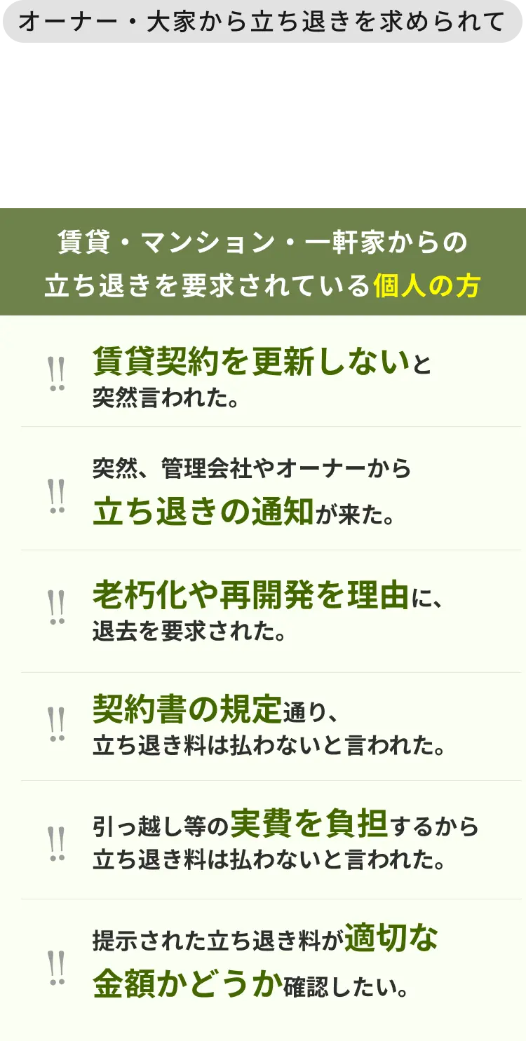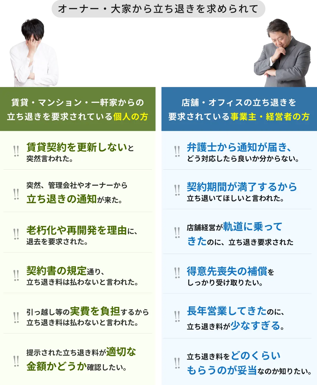 立ち退き料の相場や、立ち退き問題でトラブルになりやすいポイントを熟知している当事務所だからこそ、充実したサポートが可能です。