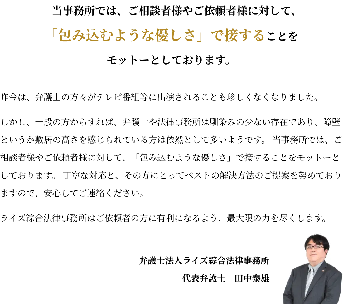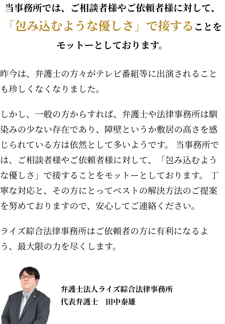 事務所名 | : | 弁護士法人ライズ綜合法律事務所 (第一東京弁護士会所属) |