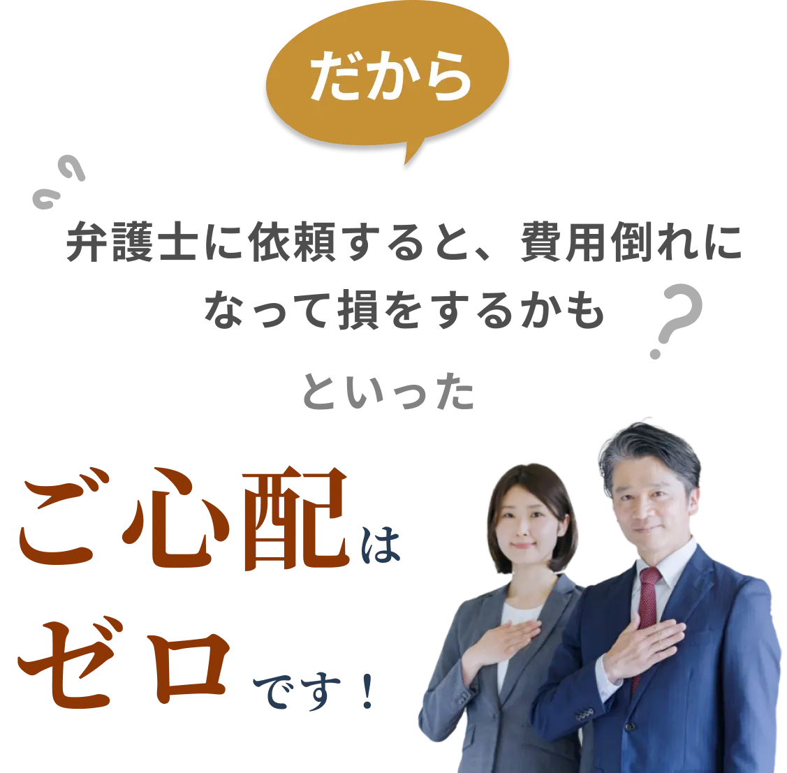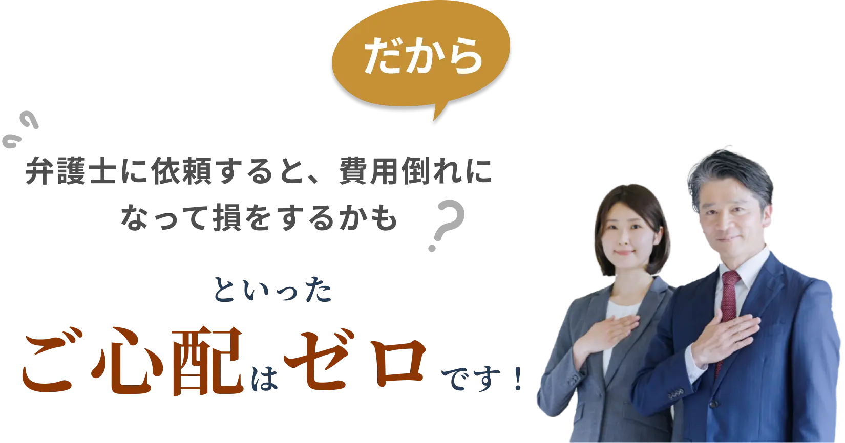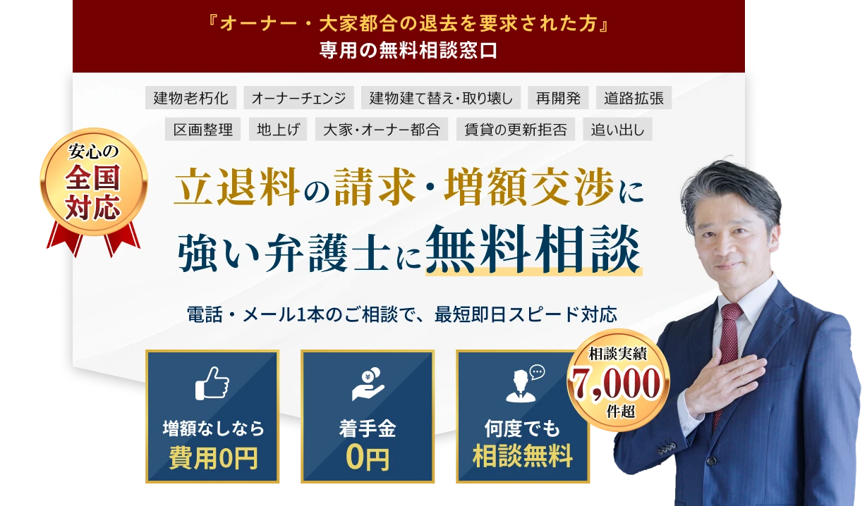 万が一、立ち退き料を増額できなかった場合、弁護士費用はいただきません。また、相談料・着手金も0円 ですので、費用倒れのご心配はゼロです。