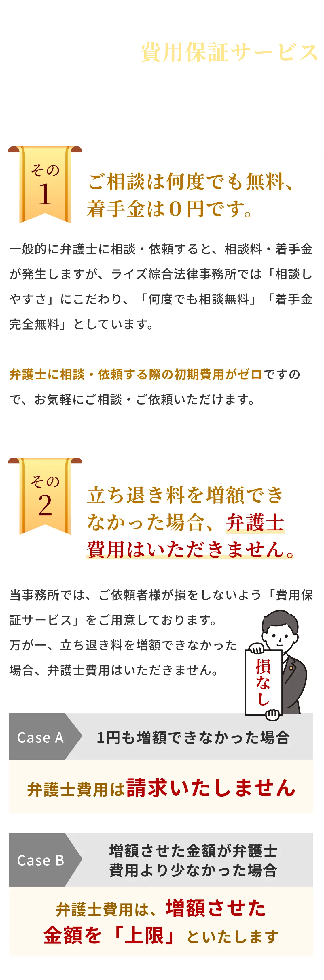 当事務所では費用の「保証サービス」を実施しており、立退料の増額ができなければ、弁護士費用はいただいておりません(※)。 また、増額できた金額が費用よりも少なかった場合、弁護士費用は増額金額を上限といたします。