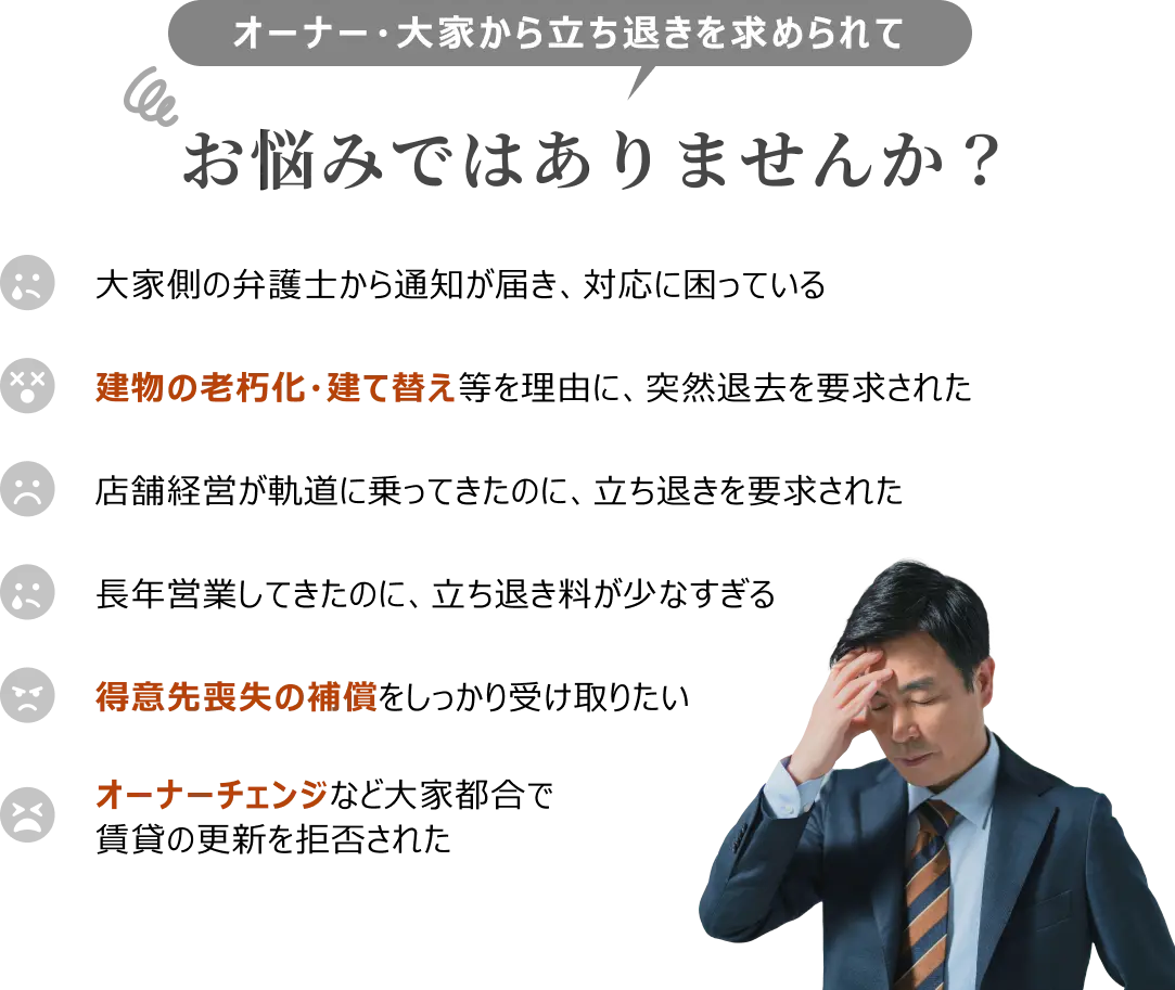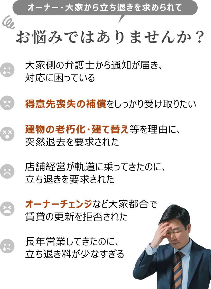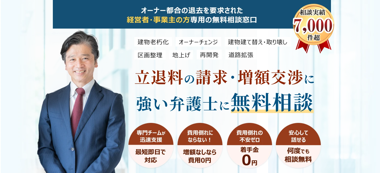 立ち退き料の相場や、立ち退き問題でトラブルになりやすいポイントを熟知している当事務所だからこそ、充実したサポートが可能です。