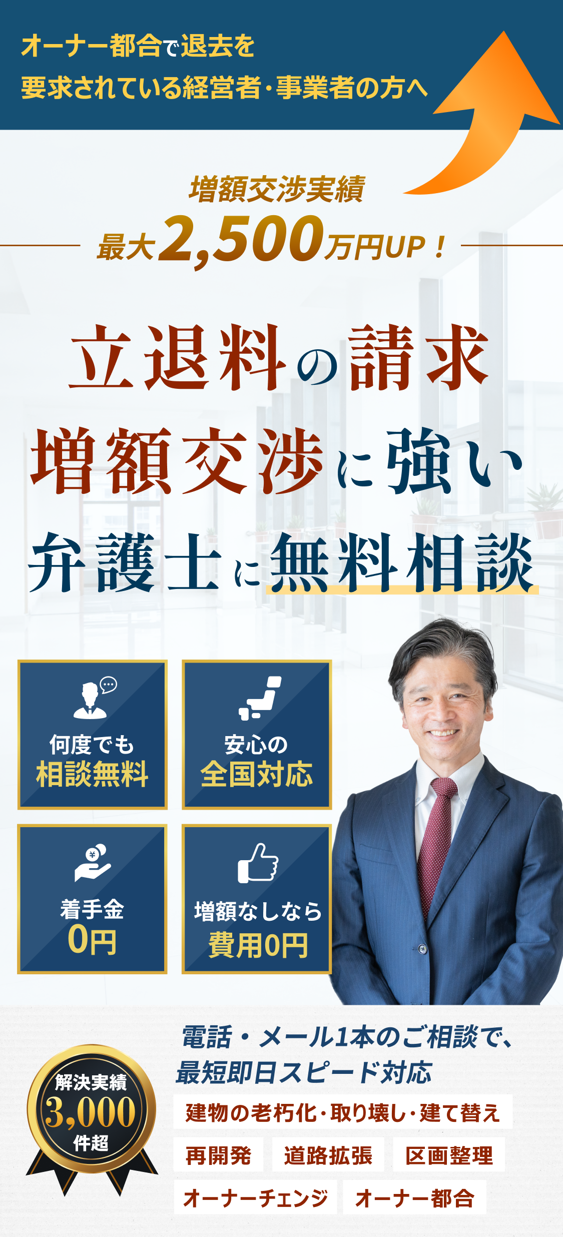 万が一、立ち退き料を増額できなかった場合、弁護士費用はいただきません。また、相談料・着手金も0円ですので、費用倒れのご心配はゼロです。