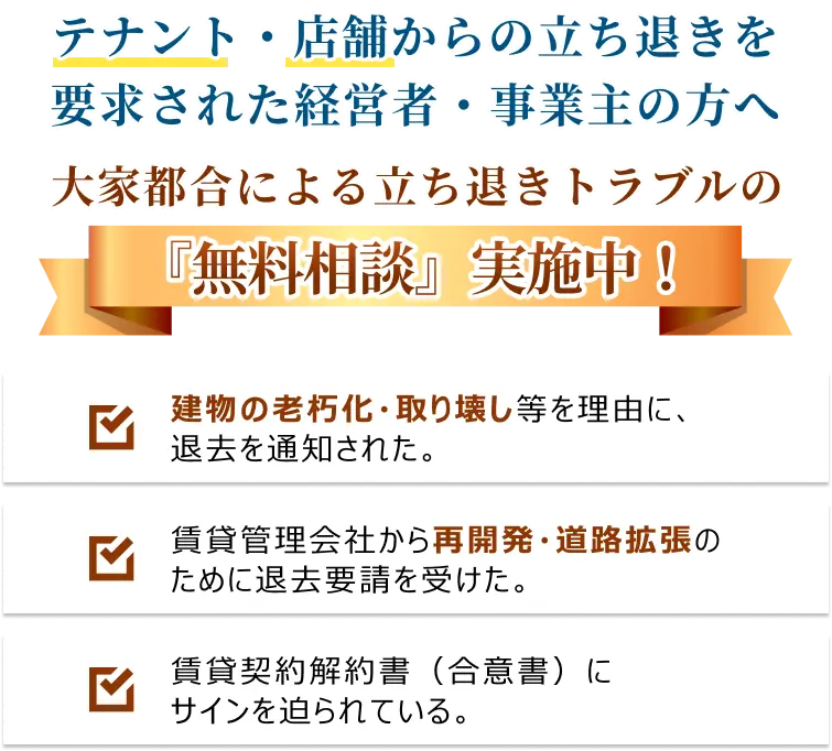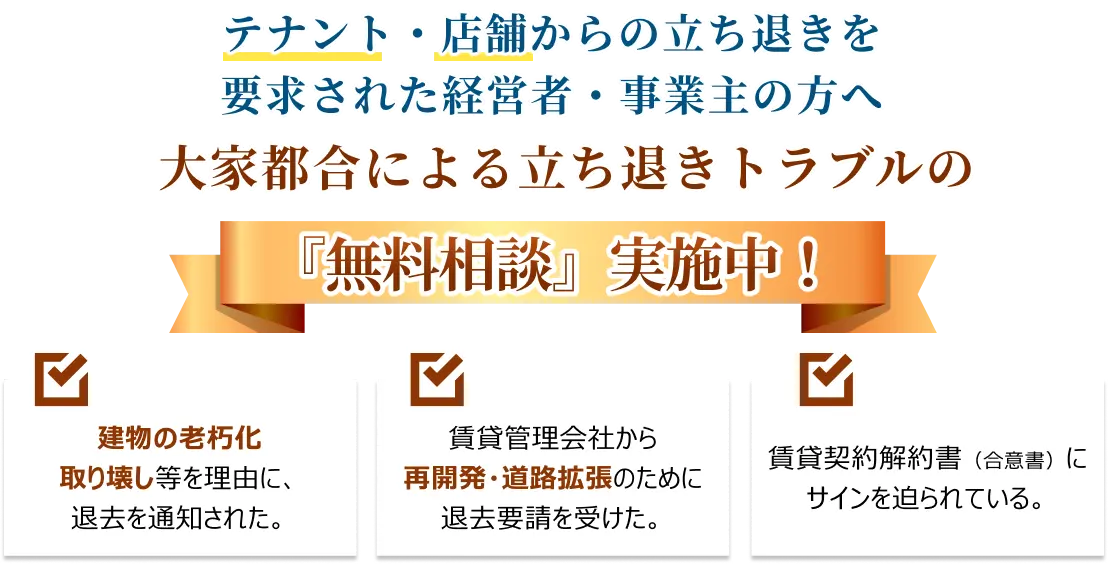 ボロボロだった店舗を手間とお金をかけて内装工事し、やっとの思いでオープンしたのが一年前でした。最近になり、ようやく馴染みのお客さんも出来てきた矢先に、不動産会社から突然の立ち退き要求。立ち退き理由は、テナントのオーナーが