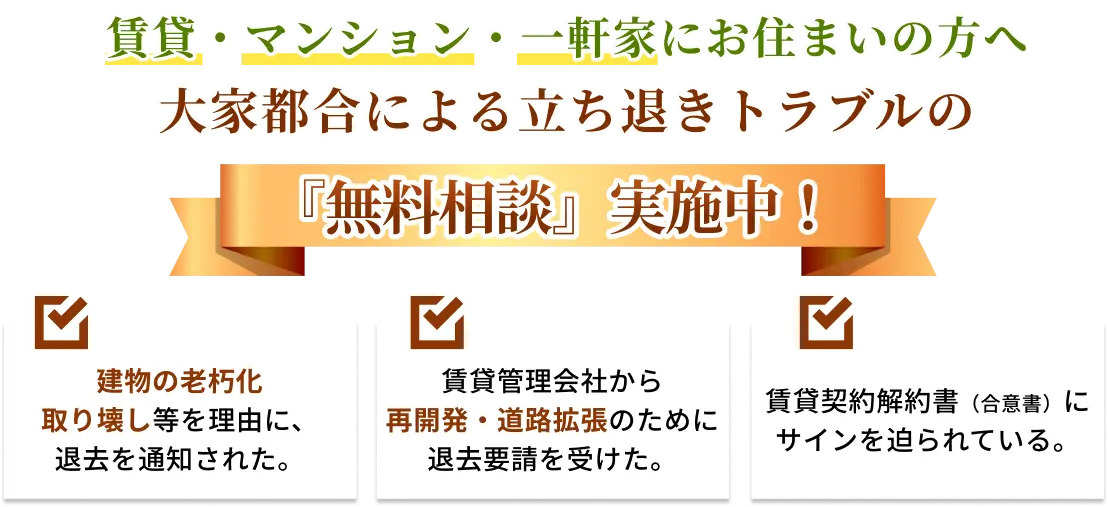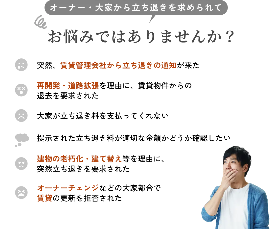 立ち退き料の相場や、立ち退き問題でトラブルになりやすいポイントを熟知している当事務所だからこそ、充実したサポートが可能です。
