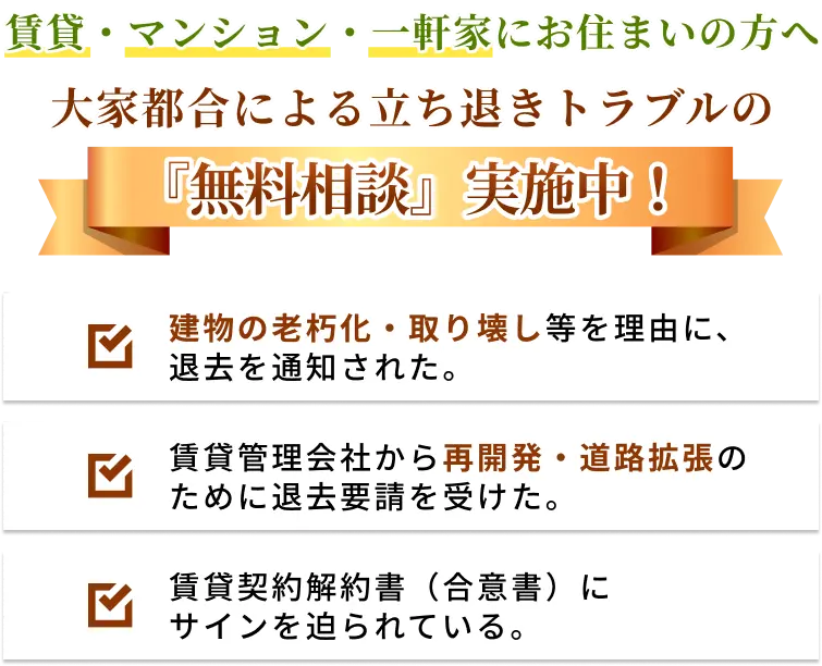 弁護士にご依頼いただくと、弁護士があなたの代理人として連絡や手続きを全て代行いたします。そのため、オーナー側からのしつこい立ち退き要請や追い出し行為はストップします。